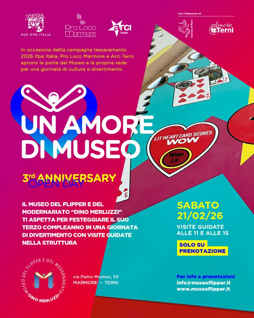 Festeggia con noi il Compleanno del Museo del flipper “Dino Merluzzi”, in occasione degli Eventi Valentiniani di Terni. Share Twitter Facebook Pinterest Email Copy Url